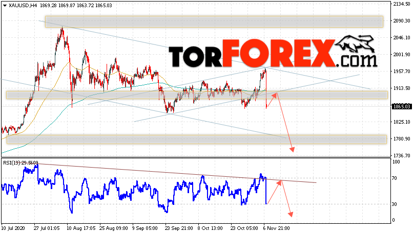 Дополнительным сигналом в пользу снижения котировок XAU/USD выступит тест линии сопротивления на индикаторе относительной силы. Вторым сигналом станет отскок от нижней границы восходящего канала. Отменой варианта падения цен на Золото 10 ноября 2020 станет сильный рост и пробой уровня 1965. Это укажет на пробой области сопротивления и продолжение роста в область выше уровня 2015. Ожидать ускорения падения котировок XAU/USD стоит с пробоем области поддержки и закрытием цены под уровнем 1855.