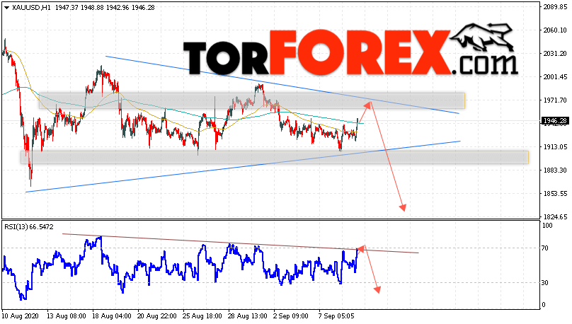 Дополнительным сигналом в пользу снижения котировок XAU/USD выступит тест линии тренда на индикаторе относительной силы. Вторым сигналом отскок от верхней границы модели ”Треугольник”. Отменой варианта падения цен на Золото 10 сентября 2020 станет сильный рост и пробой уровня 2010. Это укажет на пробой области сопротивления и продолжение роста в область выше уровня 2055. Ожидать ускорения падения котировок XAU/USD стоит с пробоем области поддержки и закрытием под уровнем 1880.