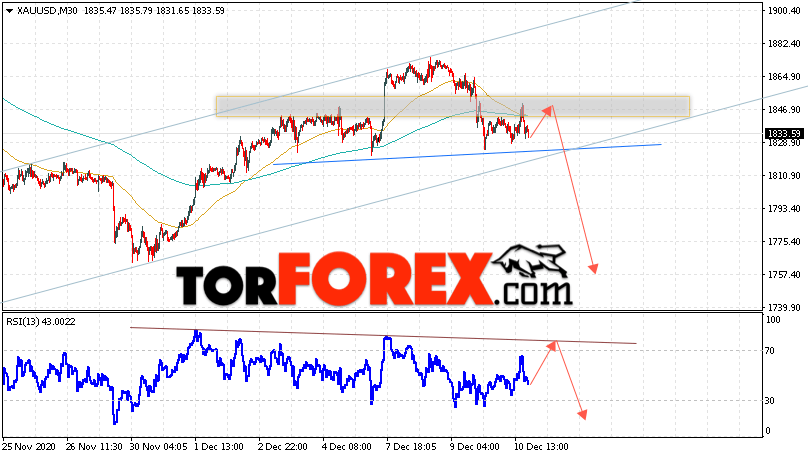 Дополнительным сигналом в пользу снижения котировок XAU/USD выступит тест линии сопротивления на индикаторе относительной силы. Вторым сигналом станет завершение формирования разворотной модели ”Голова и плечи”. Отменой варианта падения цен на Золото 11 декабря 2020 станет сильный рост и пробой уровня 1875. Это укажет на пробой области сопротивления и продолжение подъёма в область выше уровня 1925. Ожидать ускорения падения котировок XAU/USD стоит с пробоем области поддержки и закрытием цены под уровнем 1810.