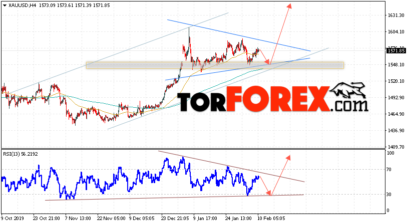 Дополнительным сигналом в пользу роста котировок XAU/USD выступит тест восходящей линии тренда на индикаторе относительной силы. Вторым сигналом станет отскок от нижней границы восходящего канала. Отменой варианта роста цен на Золото 11 февраля 2020 станет падение и пробой уровня 1525. Это укажет на пробой области поддержки и продолжение падения в область ниже уровня 1485. Ожидать ускорения роста котировок XAU/USD стоит с пробоем области сопротивления и закрытием над уровнем 1605, что укажет на выход котировок за пределы модели «Треугольник».