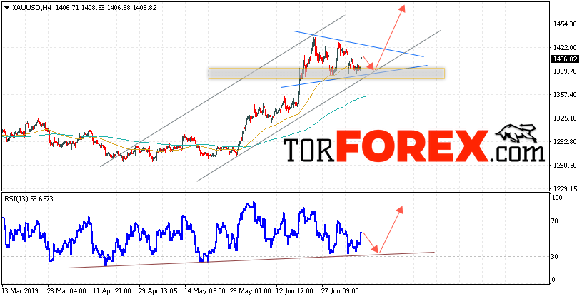 В пользу подъема котировок XAU/USD выступит тест восходящей линии тренда на индикаторе относительной силы. Вторым сигналом станет отскок от нижней границы восходящего канала. Отменой варианта роста цен на Золото 11 июля 2019 станет падение и пробой уровня 1370. Это укажет на пробой уровня поддержки и продолжение падения в область ниже уровня 1320. Ожидать ускорения роста котировок XAU/USD стоит с пробоем области сопротивления и закрытием над уровня 1435.