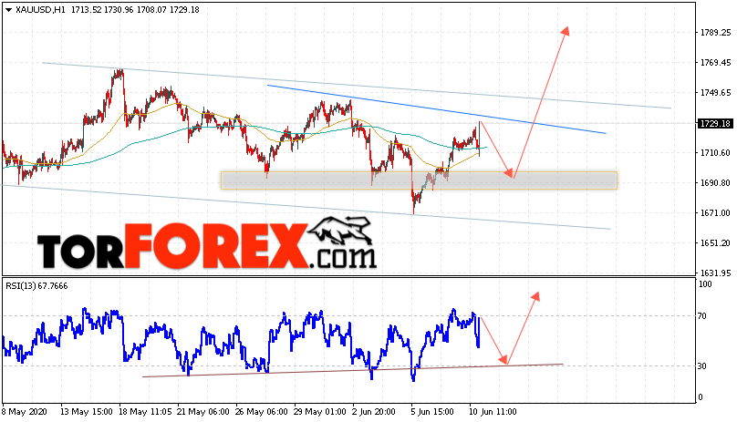 Дополнительным сигналом в пользу подъёма котировок XAU/USD выступит тест линии тренда на индикаторе относительной силы. Вторым сигналом станет завершение формирования перевернутой модели «Голова и плечи». Отменой варианта роста цен на Золото 11 июня 2020 станет падение и пробой уровня 1665. Это укажет на пробой области поддержки и продолжение падения в область ниже уровня 1615. Ожидать ускорения роста котировок XAU/USD стоит с пробоем области сопротивления и закрытием над уровнем 1730.