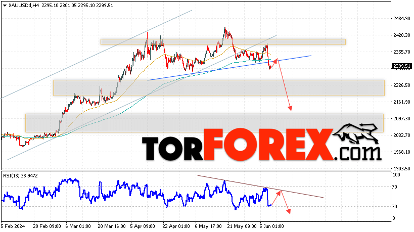 Дополнительным сигналом в пользу снижения котировок XAU/USD выступит тест линии сопротивления на индикаторе относительной силы. Вторым сигналом станет пробой от нижней границы разворотной модели. Отменой варианта снижения цен на Золото 11 июня 2024 станет сильный рост цен и пробой уровня 2365. Это укажет на пробой области сопротивления и продолжение роста котировок актива в область выше уровня 2425. Ожидать ускорения падения котировок XAU/USD стоит с пробоем области поддержки и закрытием цены под уровнем 2285.