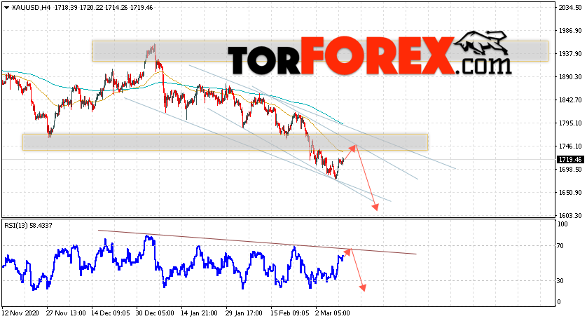 Дополнительным сигналом в пользу падения котировок XAU/USD выступит тест линии сопротивления на индикаторе относительной силы. Вторым сигналом станет отскок от верхней границы нисходящего канала. Отменой варианта падения цен на Золото 11 марта 2021 станет сильный рост и пробой уровня 1795. Это укажет на пробой области сопротивления и продолжение подъёма в область выше уровня 1875. Ожидать ускорения падения котировок XAU/USD стоит с пробоем области поддержки и закрытием цены под уровнем 1665.