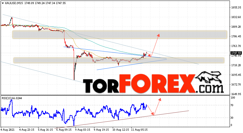 Дополнительным сигналом в пользу подъёма котировок XAU/USD выступит тест бычьей линии тренда на индикаторе относительной силы. Вторым сигналом станет отскок от верхней границы модели ”Треугольник”. Отменой варианта роста цен на Золото 12 августа 2021 станет падение и пробой уровня 1705. Это укажет на пробой области поддержки и продолжение падения в область ниже уровня 1665. Ожидать ускорения подъёма котировок XAU/USD стоит с пробоем области сопротивления и закрытием цены над уровнем 1765.