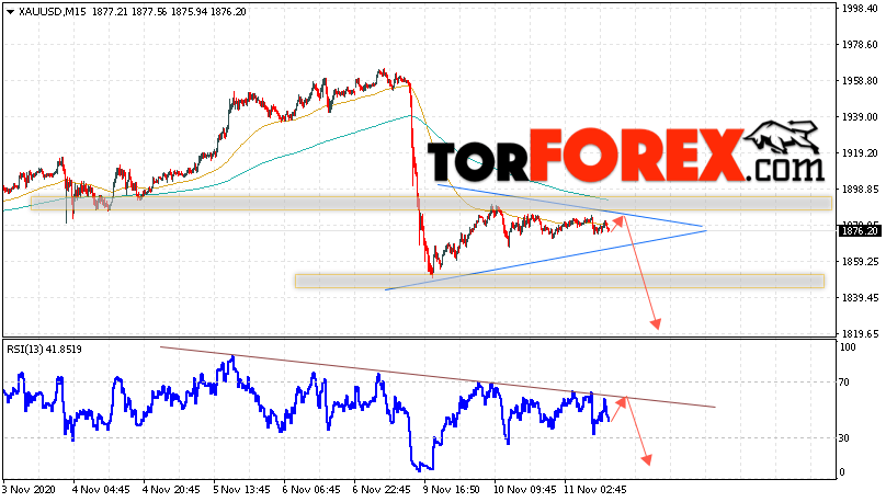 Дополнительным сигналом в пользу снижения котировок XAU/USD выступит тест линии сопротивления на индикаторе относительной силы. Вторым сигналом станет отскок от верхней границы модели ”Треугольник”. Отменой варианта падения цен на Золото 12 ноября 2020 станет сильный рост и пробой уровня 1915. Это укажет на пробой области сопротивления и продолжение роста в область выше уровня 1955. Ожидать ускорения падения котировок XAU/USD стоит с пробоем области поддержки и закрытием цены под уровнем 1855.