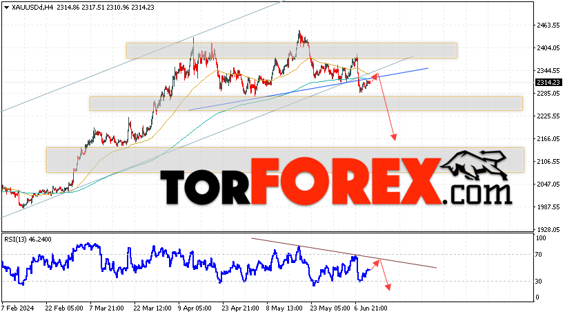 Дополнительным сигналом в пользу снижения котировок XAU/USD выступит тест линии сопротивления на индикаторе относительной силы. Вторым сигналом станет пробой от нижней границы разворотной модели «Голова и плечи». Отменой варианта снижения цен на Золото 13 июня 2024 станет сильный рост цен и пробой уровня 2375. Это укажет на пробой области сопротивления и продолжение роста котировок актива в область выше уровня 2415. Ожидать ускорения падения котировок XAU/USD стоит с пробоем области поддержки и закрытием цены под уровнем 2260.