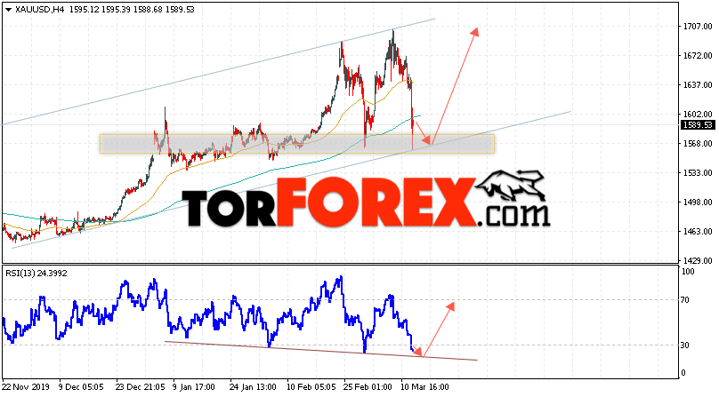 Дополнительным сигналом в пользу роста котировок XAU/USD выступит тест линии тренда на индикаторе относительной силы. Вторым сигналом станет отскок от нижней границы восходящего канала. Отменой варианта роста цен на Золото 13 марта 2020 станет падение и пробой уровня 1545. Это укажет на пробой области поддержки и продолжение падения в область ниже уровня 1505. Ожидать ускорения роста котировок XAU/USD стоит с пробоем области сопротивления и закрытием над уровнем 1635.