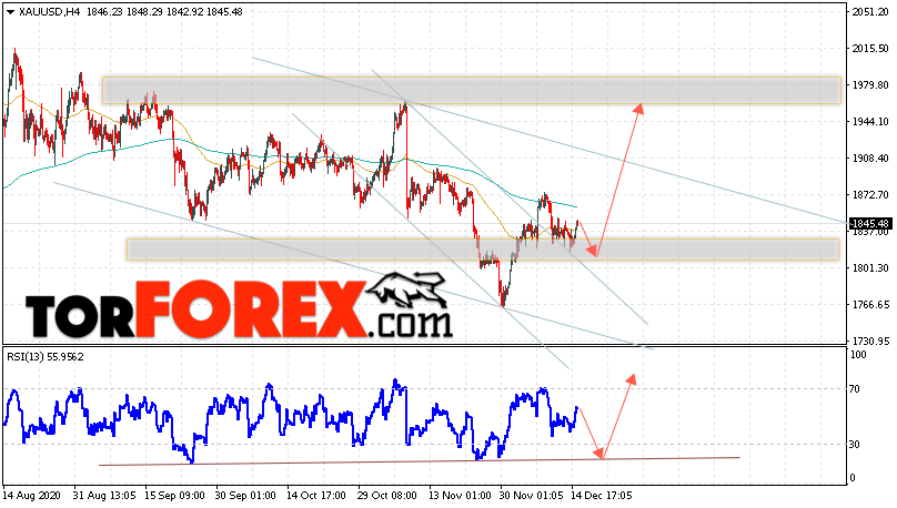 Дополнительным сигналом в пользу подъёма котировок XAU/USD выступит тест линии поддержки на индикаторе относительной силы. Вторым сигналом станет отскок от верхней границы нисходящего канала. Отменой варианта роста цен на Золото 16 декабря 2020 станет падение и пробой уровня 1775. Это укажет на пробой области поддержки и продолжение падения в область ниже уровня 1725. Ожидать ускорения роста котировок XAU/USD стоит с пробоем области сопротивления и закрытием цены над уровнем 1880.