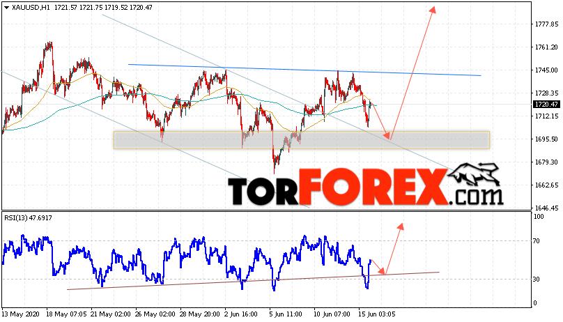 Дополнительным сигналом в пользу подъёма котировок XAU/USD выступит тест линии тренда на индикаторе относительной силы. Вторым сигналом станет завершение формирования перевернутой модели «Голова и плечи». Отменой варианта роста цен на Золото 16 июня 2020 станет падение и пробой уровня 1665. Это укажет на пробой области поддержки и продолжение падения в область ниже уровня 1620, а также на отмену формирования разворотной модели. Ожидать ускорения роста котировок XAU/USD стоит с пробоем области сопротивления и закрытием над уровнем 1730.