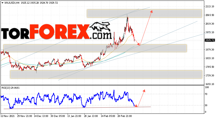 Дополнительным сигналом в пользу роста котировок XAU/USD выступит тест линии сопротивления на индикаторе относительной силы. Вторым сигналом станет отскок от нижней границы бычьего канала. Отменой варианта роста цен на Золото 16 марта 2022 станет падение и пробой уровня 1865. Это укажет на пробой области поддержки и продолжение падения в область ниже уровня 1835. Ожидать ускорения подъёма котировок XAU/USD стоит с пробоем области сопротивления и закрытием цены над уровнем 1975.