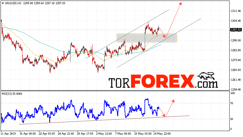 В пользу роста котировок XAU/USD выступит тест линии тренда на индикаторе относительной силы. Вторым сигналом станет отскок от нижней границы восходящего канала. Отменой варианта подъёма цен на Золото 16 мая 2019 станет падение и пробой уровня 1285. Это укажет на пробой нижней границы канала и продолжение падения в область ниже уровня 1255. Ожидать ускорения роста котировок XAU/USD стоит с пробоем верхней границы нисходящего канала и закрытием выше уровня 1305.