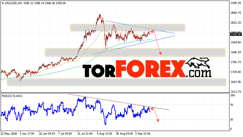 Дополнительным сигналом в пользу снижения котировок XAU/USD выступит тест линии тренда на индикаторе относительной силы. Вторым сигналом отскок от верхней границы модели ”Треугольник”. Отменой варианта падения цен на Золото 16 сентября 2020 станет сильный рост и пробой уровня 2015. Это укажет на пробой области сопротивления и продолжение роста в область выше уровня 2065. Ожидать ускорения падения котировок XAU/USD стоит с пробоем области поддержки и закрытием под уровнем 1885.