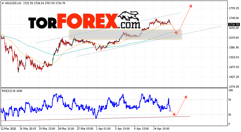 Дополнительным сигналом в пользу подъёма котировок XAU/USD выступит тест линии тренда на индикаторе относительной силы. Вторым сигналом станет отскок от нижней границы восходящего канала. Отменой варианта роста цен на Золото 17 апреля 2020 станет падение и пробой уровня 1630. Это укажет на пробой области поддержки и продолжение падения в область ниже уровня 1585. Ожидать ускорения роста котировок XAU/USD стоит с пробоем области сопротивления и закрытием над уровнем 1765.
