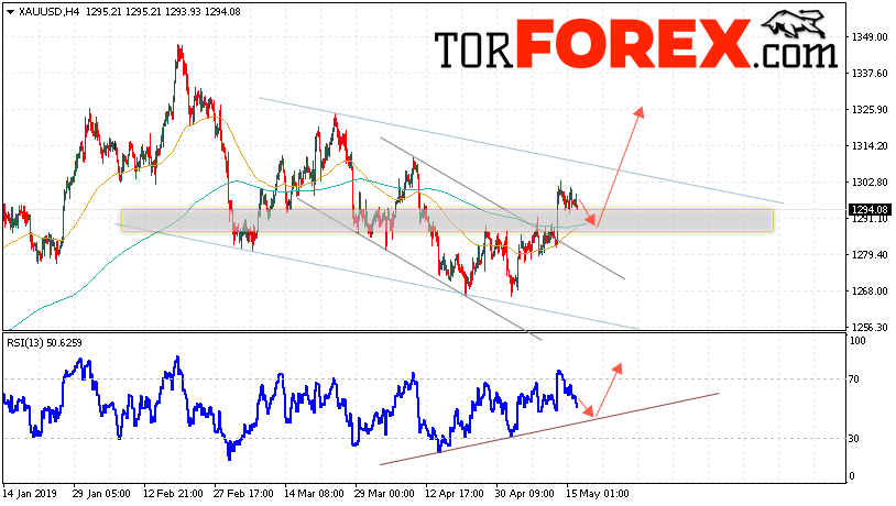 В пользу роста котировок XAU/USD выступит тест восходящей линии тренда на индикаторе относительной силы. Вторым сигналом станет отскок от верхней границы нисходящего канала. Отменой варианта подъёма цен на Золото 17 мая 2019 станет падение и пробой уровня 1280. Это укажет на пробой границы канала и продолжение падения в область ниже уровня 1255. Ожидать ускорения роста котировок XAU/USD стоит с пробоем верхней границы нисходящего канала и закрытием выше уровня 1305.