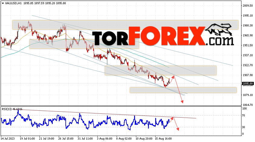 Дополнительным сигналом в пользу падения котировок XAU/USD выступит тест линии сопротивления на индикаторе относительной силы. Вторым сигналом станет отскок от верхней границы медвежьего канала. Отменой варианта падения цен на Золото 18 августа 2023 станет сильный рост и пробой уровня 1920. Это укажет на пробой области сопротивления и продолжение роста котировок актива в область выше уровня 1955. Ожидать ускорения падения котировок XAU/USD стоит с пробоем области поддержки и закрытием цены под уровнем 1885.