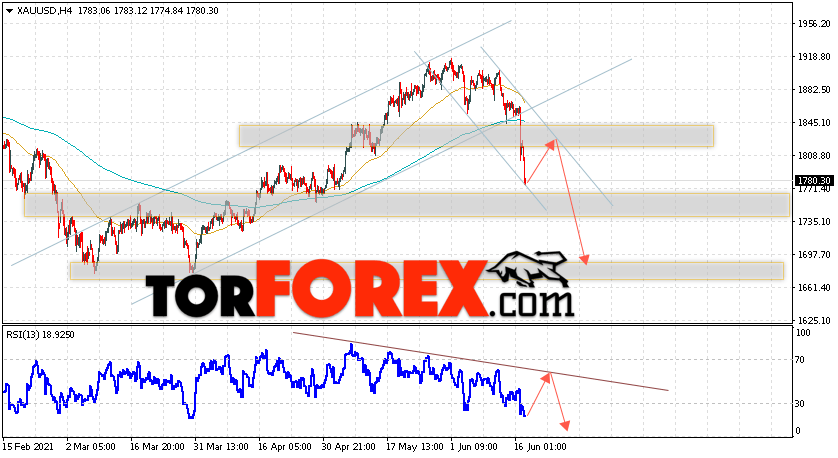 Дополнительным сигналом в пользу падения котировок XAU/USD выступит тест линии тренда на индикаторе относительной силы. Вторым сигналом станет отскок от верхней границы медвежьего канала. Отменой варианта падения цен на Золото 18 июня 2021 станет сильный рост и пробой уровня 1855. Это укажет на пробой области сопротивления и продолжение подъёма в область выше уровня 1905. Ожидать ускорения падения котировок XAU/USD стоит с пробоем области поддержки и закрытием цены под уровнем 1735.