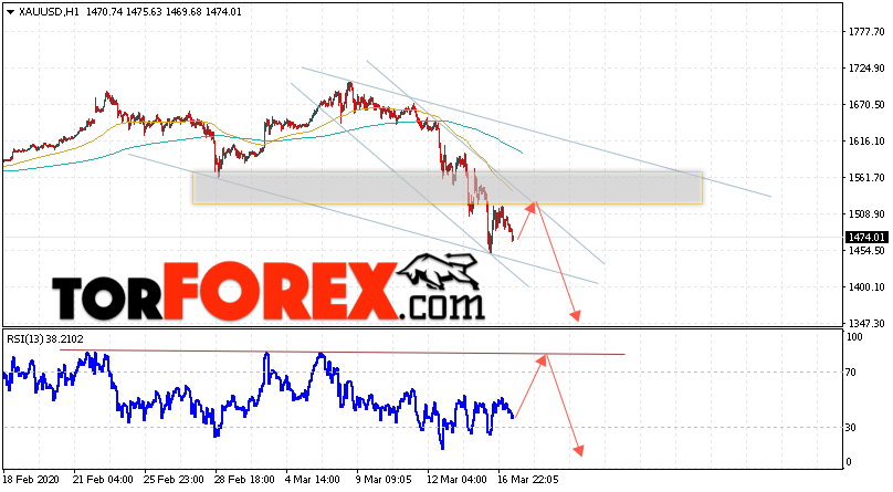 Дополнительным сигналом в пользу падения котировок XAU/USD выступит тест линии тренда на индикаторе относительной силы. Вторым сигналом станет отскок от верхней границы нисходящего канала. Отменой варианта падения цен на Золото 18 марта 2020 станет сильный рост и пробой уровня 1575. Это укажет на пробой области сопротивления и продолжение роста в область выше уровня 1635. Ожидать ускорения падения котировок XAU/USD стоит с пробоем области поддержки и закрытием под уровнем 1435.