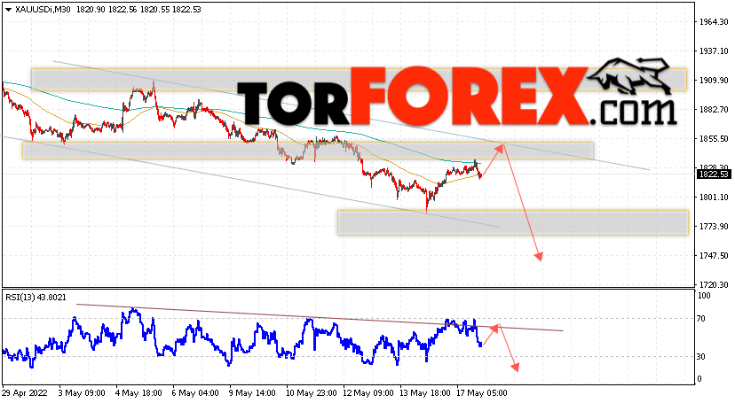 Дополнительным сигналом в пользу падения котировок XAU/USD выступит тест линии сопротивления на индикаторе относительной силы. Вторым сигналом станет отскок от верхней границы нисходящего канала. Отменой варианта подъёма цен на Золото 18 мая 2022 станет сильный рост и пробой уровня 1875. Это укажет на пробой области сопротивления и продолжение подъёма в область выше уровня 1925. Ожидать ускорения падения котировок XAU/USD стоит с пробоем области поддержки и закрытием цены под уровнем 1805.
