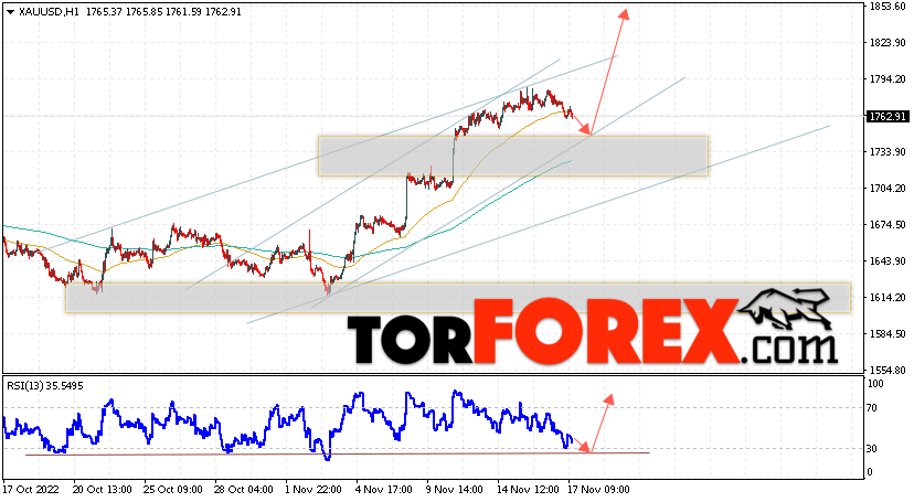 Дополнительным сигналом в пользу подъёма котировок XAU/USD выступит тест линии поддержки на индикаторе относительной силы. Вторым сигналом станет отскок от нижней границы бычьего канала. Отменой варианта подъёма цен на Золото 18 ноября 2022 станет падение и пробой уровня 1725. Это укажет на пробой области поддержки и продолжение падения в область ниже уровня 1685. Ожидать ускорения роста котировок XAU/USD стоит с пробоем области сопротивления и закрытием цены над уровнем 1795.