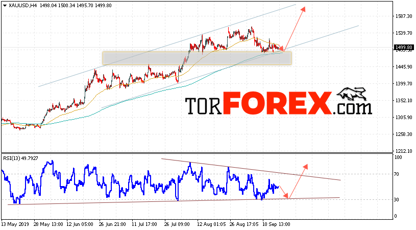 В пользу подъема котировок XAU/USD выступит тест восходящей линии поддержки на индикаторе относительной силы. Вторым сигналом в пользу подъёма цен на Золото станет отскок от нижней границы восходящего канала. Отменой варианта роста цен на Золото 18 сентября 2019 станет падение и пробой уровня 1465. Это укажет на пробой нижней границы канала и продолжение падения в область ниже уровня 1425. Ожидать ускорения роста котировок XAU/USD стоит с пробоем области сопротивления и закрытием над уровнем 1535.