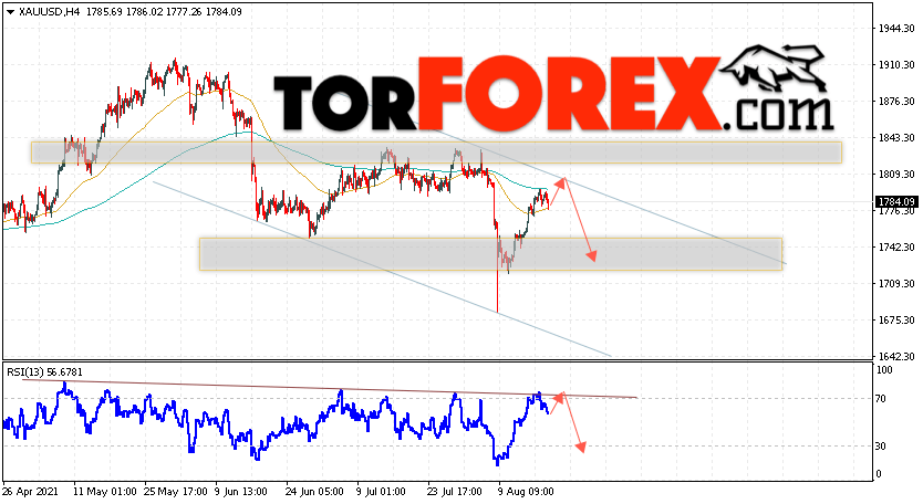 Дополнительным сигналом в пользу снижения котировок XAU/USD выступит тест области сопротивления на индикаторе относительной силы. Вторым сигналом станет отскок от верхней границы нисходящего канала. Отменой варианта падения цен на Золото 19 августа 2021 станет сильный рост и пробой уровня 1845. Это укажет на пробой области сопротивления и продолжение подъёма в область выше уровня 1875. Ожидать ускорения падения котировок XAU/USD стоит с пробоем области поддержки и закрытием цены под уровнем 1780.