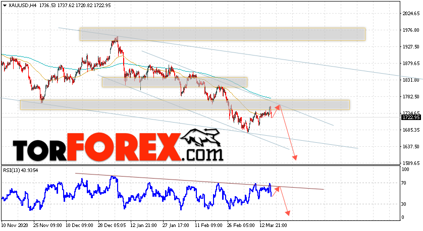 Дополнительным сигналом в пользу падения котировок XAU/USD выступит тест линии сопротивления на индикаторе относительной силы. Вторым сигналом станет отскок от верхней границы нисходящего канала. Отменой варианта падения цен на Золото 19 марта 2021 станет сильный рост и пробой уровня 1795. Это укажет на пробой области сопротивления и продолжение подъёма в область выше уровня 1875. Ожидать ускорения падения котировок XAU/USD стоит с пробоем области поддержки и закрытием цены под уровнем 1675.