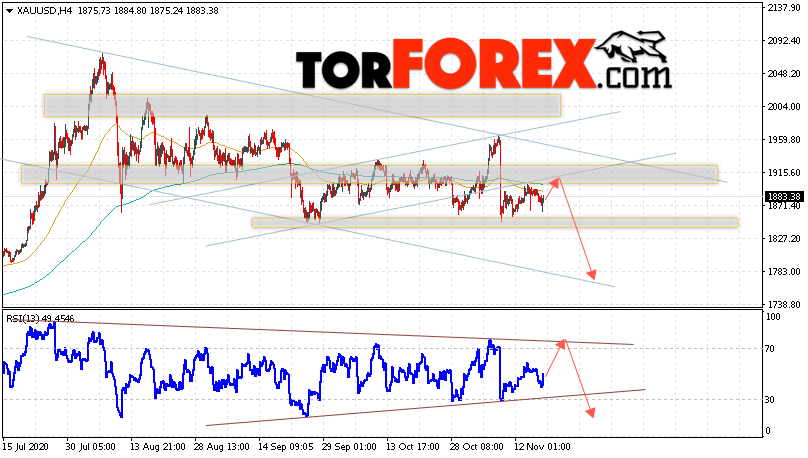 Дополнительным сигналом в пользу снижения котировок XAU/USD выступит тест линии сопротивления на индикаторе относительной силы. Вторым сигналом станет отскок от нижней границы восходящего канала. Отменой варианта падения цен на Золото 19 ноября 2020 станет сильный рост и пробой уровня 1965. Это укажет на пробой области сопротивления и продолжение роста в область выше уровня 2015. Ожидать ускорения падения котировок XAU/USD стоит с пробоем области поддержки и закрытием цены под уровнем 1835.