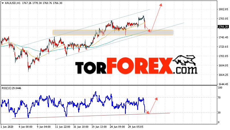Дополнительным сигналом в пользу подъёма котировок XAU/USD выступит тест линии тренда на индикаторе относительной силы. Вторым сигналом отскок от нижней границы восходящего канала. Отменой варианта роста цен на Золото 2 июля 2020 станет падение и пробой уровня 1735. Это укажет на пробой области поддержки и продолжение падения в область ниже уровня 1685. Ожидать ускорения роста котировок XAU/USD стоит с пробоем области сопротивления и закрытием над уровнем 1795.