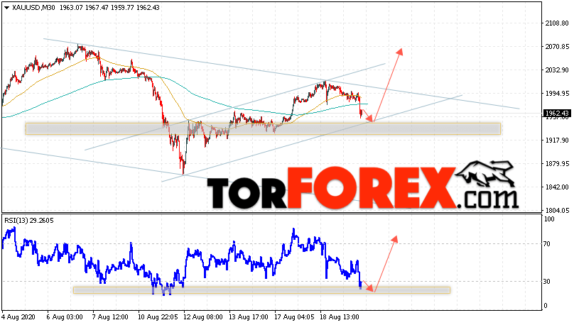 Дополнительным сигналом в пользу роста котировок XAU/USD выступит тест линии тренда на индикаторе относительной силы. Вторым сигналом отскок от нижней границы восходящего канала. Отменой варианта роста цен на Золото 20 августа 2020 станет падение и пробой уровня 1920. Это укажет на пробой области поддержки и продолжение падения в область ниже уровня 1875. Ожидать ускорения подъёма котировок XAU/USD стоит с пробоем области сопротивления и закрытием над уровнем 2025.