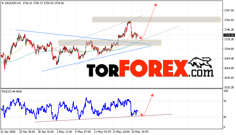 Дополнительным сигналом в пользу подъёма котировок XAU/USD выступит тест линии тренда на индикаторе относительной силы. Вторым сигналом станет отскок от верхней границы модели «Треугольник». Отменой варианта роста цен на Золото 20 мая 2020 станет падение и пробой уровня 1705. Это укажет на пробой области поддержки и продолжение падения в область ниже уровня 1655. Ожидать ускорения роста котировок XAU/USD стоит с пробоем области сопротивления и закрытием над уровнем 1775.