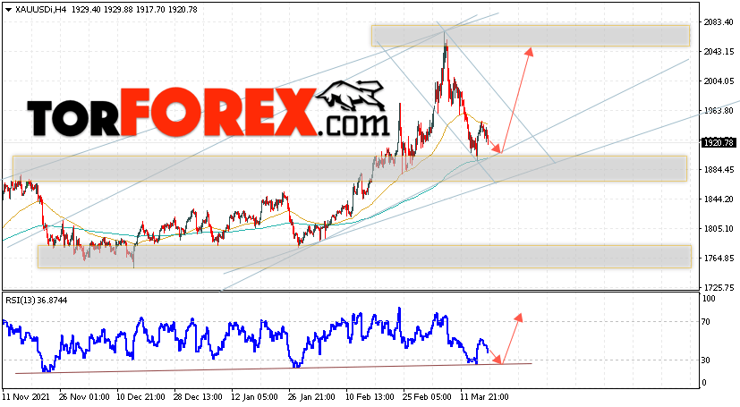 Дополнительным сигналом в пользу роста котировок XAU/USD выступит тест линии сопротивления на индикаторе относительной силы. Вторым сигналом станет отскок от нижней границы бычьего канала. Отменой варианта роста цен на Золото 21 марта 2022 станет падение и пробой уровня 1880. Это укажет на пробой области поддержки и продолжение падения в область ниже уровня 1825. Ожидать ускорения подъёма котировок XAU/USD стоит с пробоем области сопротивления и закрытием цены над уровнем 1975, что укажет на пробой верхней границы нисходящего канала коррекции.
