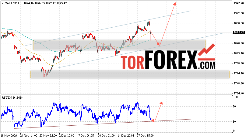 Дополнительным сигналом в пользу подъёма котировок XAU/USD выступит тест линии поддержки на индикаторе относительной силы. Вторым сигналом станет отскок от нижней границы восходящего канала. Отменой варианта роста цен на Золото 22 декабря 2020 станет падение и пробой уровня 1815. Это укажет на пробой области поддержки и продолжение падения в область ниже уровня 1775. Ожидать ускорения роста котировок XAU/USD стоит с пробоем области сопротивления и закрытием цены над уровнем 1905.