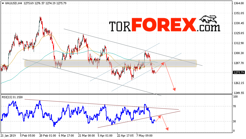 В пользу снижения котировок XAU/USD выступит тест нисходящей линии тренда на индикаторе относительной силы. Вторым сигналом станет отскок от верхней границы нисходящего канала. Отменой варианта подъёма цен на Золото 22 мая 2019 станет падение и пробой уровня 1305. Это укажет на пробой верхней границы канала и продолжение роста в область выше уровня 1345. Ожидать ускорения падения котировок XAU/USD стоит с пробоем области поддержки и закрытием ниже уровня 1265.