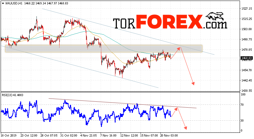 Дополнительным сигналом в пользу снижения котировок XAU/USD выступит тест линии тренда на индикаторе относительной силы. Вторым сигналом в пользу падения цен на Золото станет отскок от верхней границы нисходящего канала. Отменой варианта снижения цен на Золото 22 ноября 2019 станет сильный рост и пробой уровня 1505. Это укажет на пробой области сопротивления и продолжение роста в область выше уровня 1565. Ожидать ускорения падения котировок XAU/USD стоит с пробоем области поддержки и закрытием под уровнем 1450.