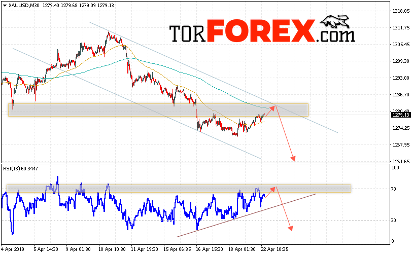 В пользу снижения котировок XAU/USD выступит тест линии тренда на индикаторе относительной силы. Вторым сигналом станет отскок от верхней границы нисходящего канала. Отменой варианта падения цен на Золото 23 апреля 2019 станет сильный рост и пробой 1295. Это укажет на пробой верхней границы канала и продолжение роста в область выше уровня 1310. Ожидать ускорения падения котировок XAU/USD стоит с пробоем области поддержки и закрытием ниже уровня 1265.
