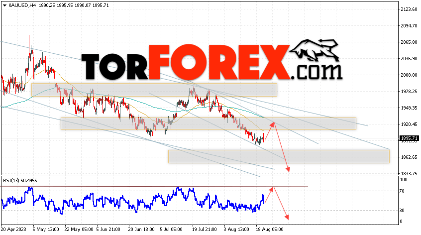 Дополнительным сигналом в пользу падения котировок XAU/USD выступит тест линии сопротивления на индикаторе относительной силы. Вторым сигналом станет отскок от верхней границы медвежьего канала. Отменой варианта падения цен на Золото 23 августа 2023 станет сильный рост и пробой уровня 1945. Это укажет на пробой области сопротивления и продолжение роста котировок актива в область выше уровня 1995. Ожидать ускорения падения котировок XAU/USD стоит с пробоем области поддержки и закрытием цены под уровнем 1885.
