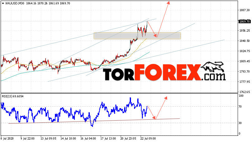Дополнительным сигналом в пользу подъёма котировок XAU/USD выступит тест линии тренда на индикаторе относительной силы. Вторым сигналом отскок от нижней границы восходящего канала. Отменой варианта роста цен на Золото 23 июля 2020 станет падение и пробой уровня 1835. Это укажет на пробой области поддержки и продолжение падения в область ниже уровня 1805. Ожидать ускорения роста котировок XAU/USD стоит с пробоем области сопротивления и закрытием над уровнем 1895.