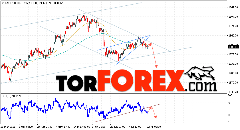 Дополнительным сигналом в пользу снижения котировок XAU/USD выступит тест линии пробитой линии тренда на индикаторе относительной силы. Вторым сигналом станет отскок от нижней границы разворотной модели ”Клин”. Отменой варианта падения цен на Золото 23 июля 2021 станет сильный рост и пробой уровня 1845. Это укажет на пробой области сопротивления и продолжение подъёма в область выше уровня 1885. Ожидать ускорения падения котировок XAU/USD стоит с пробоем области поддержки и закрытием цены под уровнем 1785.