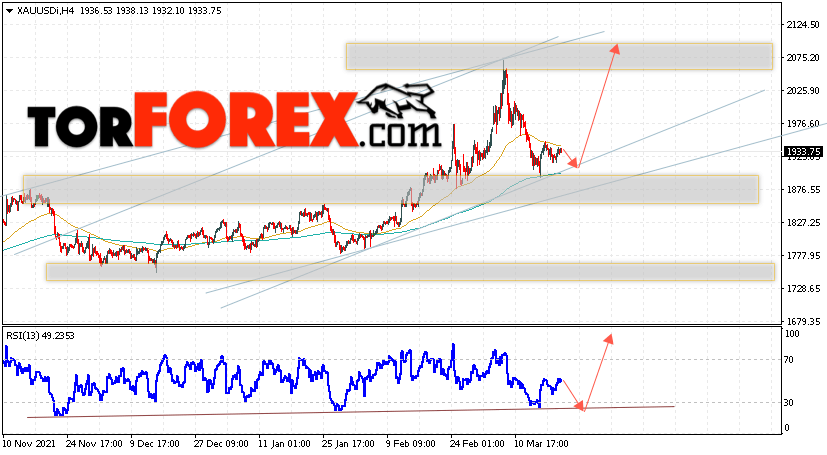 Дополнительным сигналом в пользу роста котировок XAU/USD выступит тест линии сопротивления на индикаторе относительной силы. Вторым сигналом станет отскок от нижней границы бычьего канала. Отменой варианта роста цен на Золото 23 марта 2022 станет падение и пробой уровня 1875. Это укажет на пробой области поддержки и продолжение падения в область ниже уровня 1835. Ожидать ускорения подъёма котировок XAU/USD стоит с пробоем области сопротивления и закрытием цены над уровнем 1975.