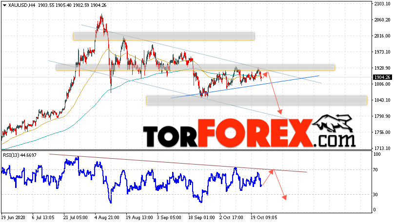 Дополнительным сигналом в пользу падения котировок XAU/USD выступит тест линии сопротивления на индикаторе относительной силы. Вторым сигналом станет отскок от верхней границы нисходящего канала. Отменой варианта падения цен на Золото 23 октября 2020 станет сильный рост и пробой уровня 1955. Это укажет на пробой области сопротивления и продолжение роста в область выше уровня 1995. Ожидать ускорения падения котировок XAU/USD стоит с пробоем области поддержки и закрытием цены под уровнем 1865, такое падение укажет на завершение формирования разворотной модели ”Голова и плечи” и начала отработки данной модели.