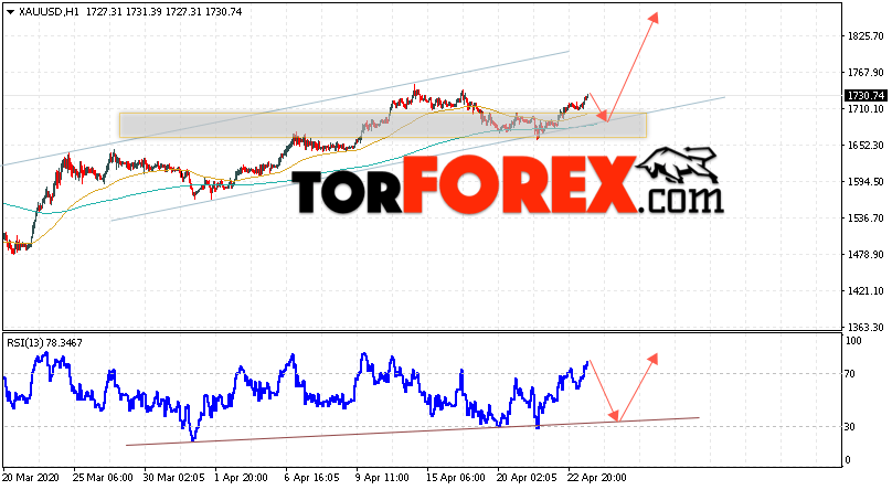 Дополнительным сигналом в пользу подъёма котировок XAU/USD выступит тест линии тренда на индикаторе относительной силы. Вторым сигналом станет отскок от нижней границы восходящего канала. Отменой варианта роста цен на Золото 24 апреля 2020 станет падение и пробой уровня 1655. Это укажет на пробой области поддержки и продолжение падения в область ниже уровня 1605. Ожидать ускорения роста котировок XAU/USD стоит с пробоем области сопротивления и закрытием над уровнем 1745.