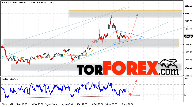 Дополнительным сигналом в пользу роста котировок XAU/USD выступит тест линии сопротивления на индикаторе относительной силы. Вторым сигналом станет отскок от нижней границы бычьего канала. Отменой варианта роста цен на Золото 24 марта 2022 станет падение и пробой уровня 1875. Это укажет на пробой области поддержки и продолжение падения в область ниже уровня 1835. Ожидать ускорения подъёма котировок XAU/USD стоит с пробоем области сопротивления и закрытием цены над уровнем 1975, что укажет на пробой верхней границы модели ”Треугольник».