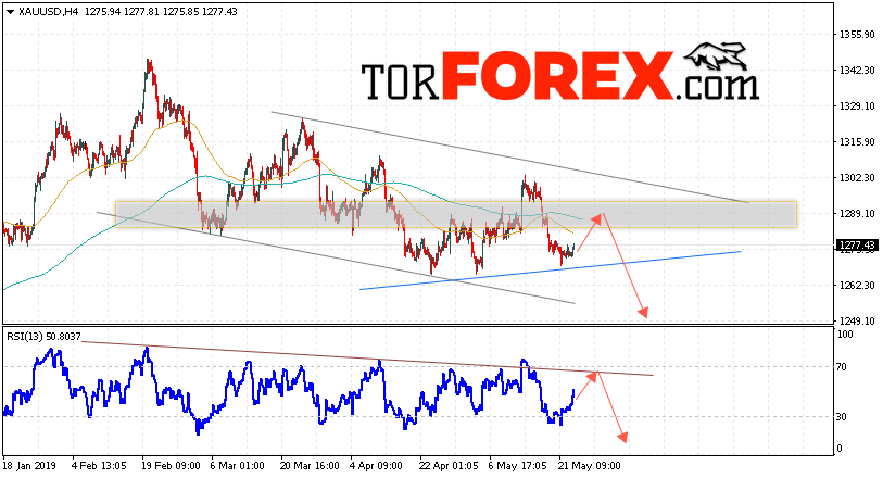 Таким образом, XAU/USD прогноз цен на Золото на 24 мая 2019 предполагает попытку теста области сопротивления вблизи уровня 1290. Далее, продолжение падения котировок с целью ниже уровня 1250. Отменой варианта падения цен на Золото выступит сильный рост и пробой уровня 1305. Это укажет на пробой верхней границы канала. В этом случае стоит ожидать продолжения подъёма Золота выше уровня 1345.