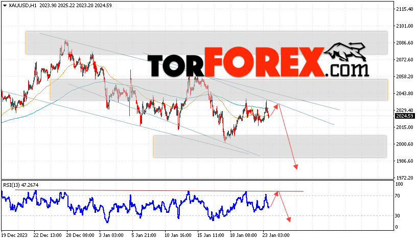 Дополнительным сигналом в пользу снижения котировок XAU/USD выступит тест линии сопротивления на индикаторе относительной силы. Вторым сигналом станет отскок от верхней границы медвежьего канала. Отменой варианта падения цен на Золото 24 января 2024 станет сильный рост цен и пробой уровня 2055. Это укажет на пробой области сопротивления и продолжение роста котировок актива в область выше уровня 2095. Ожидать ускорения падения котировок XAU/USD стоит с пробоем области поддержки и закрытием цены под уровнем 2010.