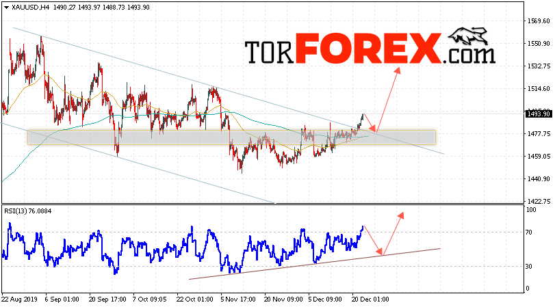 Дополнительным сигналом в пользу роста котировок XAU/USD выступит тест восходящей линии тренда на индикаторе относительной силы. Вторым сигналом в пользу подъёма цен на Золото станет отскок от нижней границы восходящего канала. Отменой варианта роста цен на Золото 25 декабря 2019 станет падение и пробой уровня 1460. Это укажет на пробой области поддержки и продолжение падения в область ниже уровня 1415. Ожидать ускорения роста котировок XAU/USD стоит с пробоем области сопротивления и закрытием над уровнем 1505.