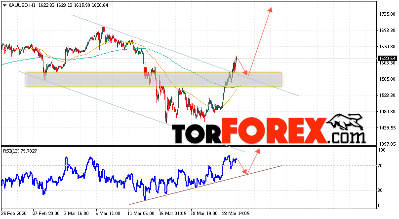 Дополнительным сигналом в пользу роста котировок XAU/USD выступит тест линии тренда на индикаторе относительной силы. Вторым сигналом станет отскок от верхней границы нисходящего канала. Отменой варианта подъёма цен на Золото 25 марта 2020 станет падение и пробой уровня 1525. Это укажет на пробой области поддержки и продолжение падения в область ниже уровня 1465. Ожидать ускорения роста котировок XAU/USD стоит с пробоем области сопротивления и закрытием над уровнем 1635.