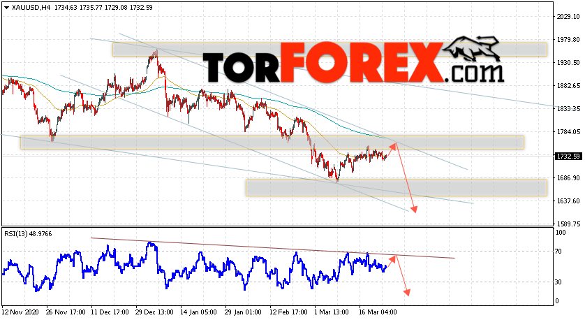 Дополнительным сигналом в пользу падения котировок XAU/USD выступит тест линии сопротивления на индикаторе относительной силы. Вторым сигналом станет отскок от верхней границы нисходящего канала. Отменой варианта падения цен на Золото 25 марта 2021 станет сильный рост и пробой уровня 1795. Это укажет на пробой области сопротивления и продолжение подъёма в область выше уровня 1865. Ожидать ускорения падения котировок XAU/USD стоит с пробоем области поддержки и закрытием цены под уровнем 1685.