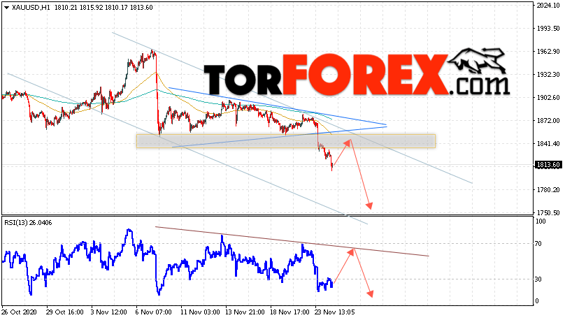 Дополнительным сигналом в пользу снижения котировок XAU/USD выступит тест линии сопротивления на индикаторе относительной силы. Вторым сигналом станет отскок от нижней границы модели ”Треугольник”. Отменой варианта падения цен на Золото 25 ноября 2020 станет сильный рост и пробой уровня 1885. Это укажет на пробой области сопротивления и продолжение роста в область выше уровня 1965. Ожидать ускорения падения котировок XAU/USD стоит с пробоем области поддержки и закрытием цены под уровнем 1775.