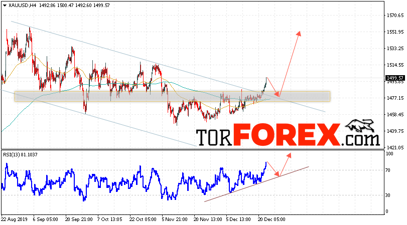 Дополнительным сигналом в пользу роста котировок XAU/USD выступит тест восходящей линии тренда на индикаторе относительной силы. Вторым сигналом в пользу подъёма цен на Золото станет отскок от нижней границы восходящего канала. Отменой варианта роста цен на Золото 26 декабря 2019 станет падение и пробой уровня 1460. Это укажет на пробой области поддержки и продолжение падения в область ниже уровня 1415. Ожидать ускорения роста котировок XAU/USD стоит с пробоем области сопротивления и закрытием над уровнем 1515.